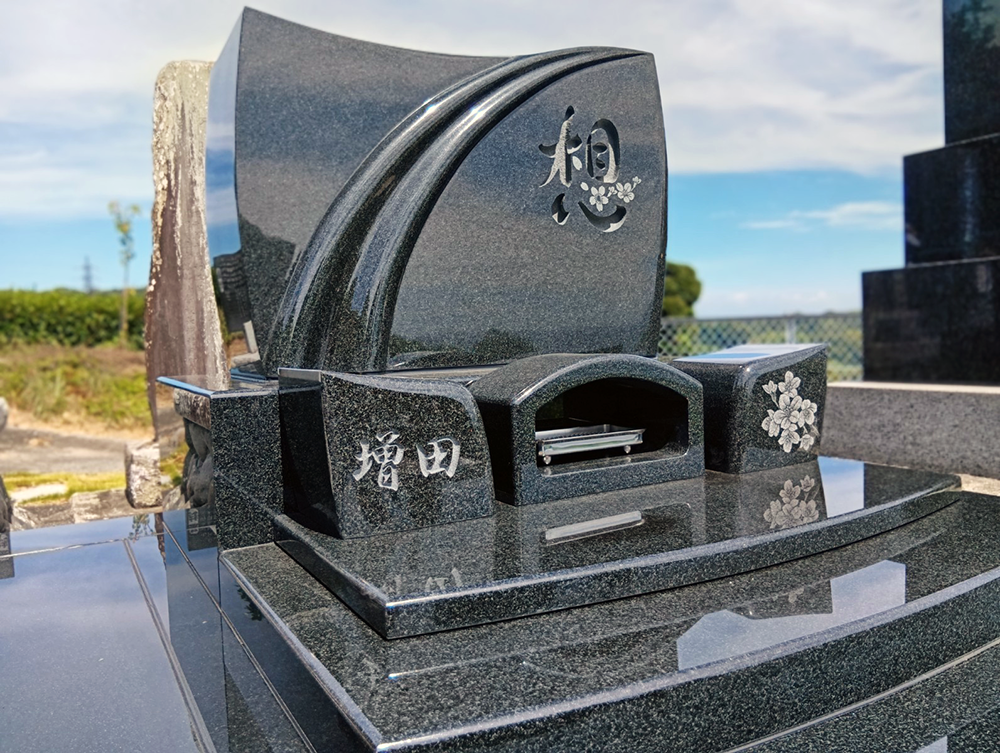 主人の遺作となりました。生前お墓作りにいろいろなアイデアを出す中各所お墓を見て廻り、何度も図案を考え5mmの違いにもこだわり