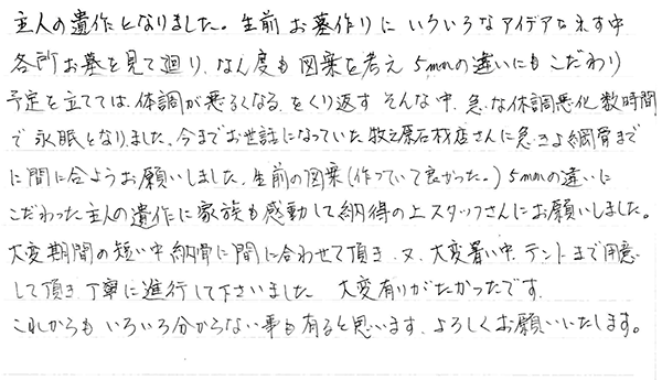に間に合うようお願いしました。生前の図案(作っていて良かった。)5mmの違いにこだわった主人の遺作に家族も感動して納得の上スタッフさんにお願いしました。